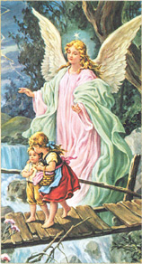 Guardian Angel watching over a young girls crossing a bridge. Gold edges.