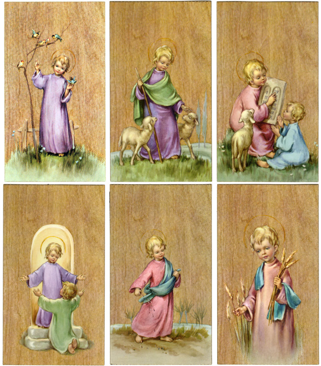 Ten assorted children cards lithographed in Full color with gold edges. A truly unique series. Assorted only. (Not all cards are included in each box.) Card size: 2 1/4" x 4"