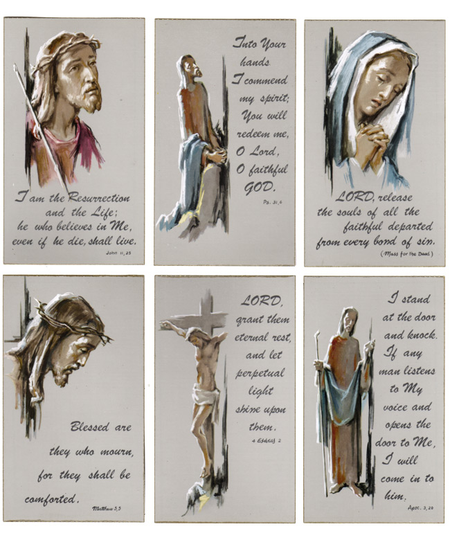 Six modernistic memorial subjects with conforting text in full color and gold edging. Assorted only. (Not all cards are included in each box.) Card size: 2 3/8" x 4 1/8".
