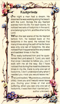 One night a man had a dream. He dreamed he was walking along the beach with the Lord. Across the sky flashed scenes from his life. For each scene, he noticed two sets of footprints in the sand; one belonging to him, and the other to the Lord.